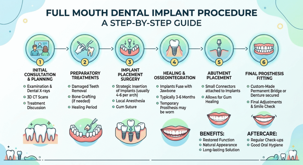 Full-mouth dental implant treatment is a carefully planned and systematic process designed to restore a complete and functional smile. The procedure involves several key stages to ensure the best possible results for each patient: