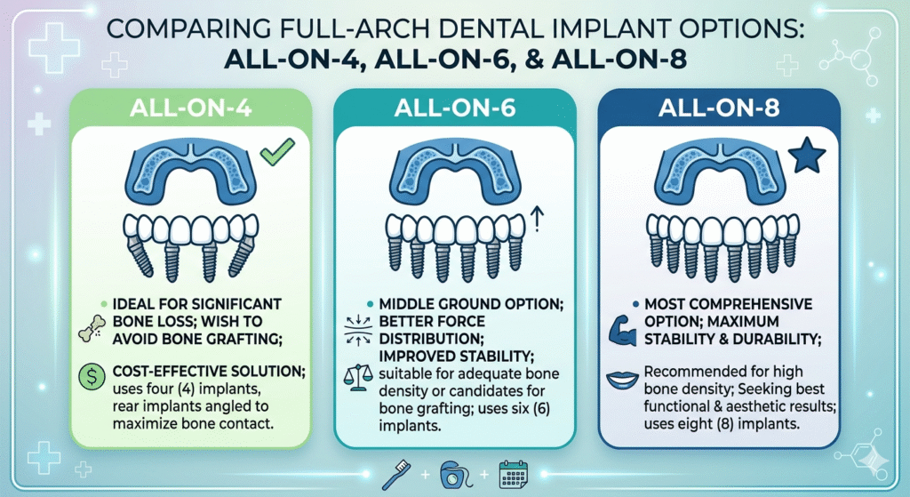 - All-on-8: The most comprehensive option, using eight implants for maximum stability and durability. Recommended for patients with high bone density seeking the best functional and aesthetic results.