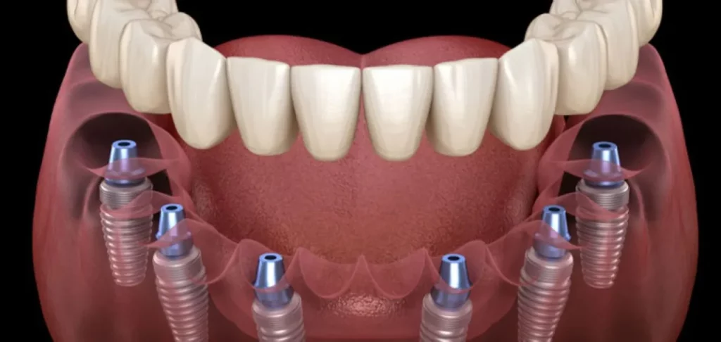 All-on-6 dental implants use six strategically placed titanium implants to anchor a temporary or permanent temporary prosthesis