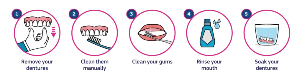 - Maintain good oral hygiene: Clean your dentures thoroughly using a denture brush or a soft-bristled toothbrush and mild denture cleanser. Additionally, brush your teeth, gums, tongue, and palate with a soft toothbrush to keep them clean and healthy.