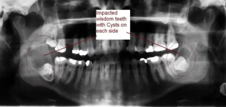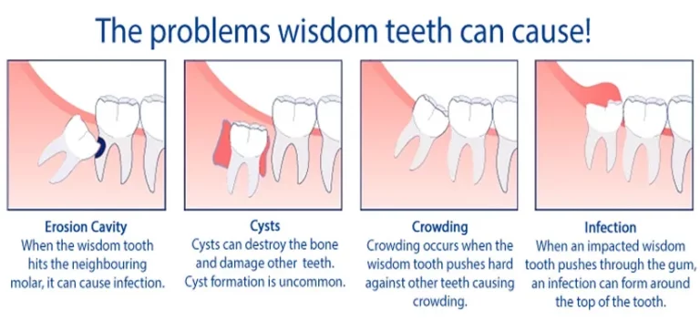 In some cases, the sac surrounding exposed bone of an impacted wisdom teeth or wisdom teeth extraction or tooth can develop fluid-filled cysts or, rarely, tumors. These can cause damage to the surrounding bone of impacted wisdom teeth and neighboring teeth if left untreated.